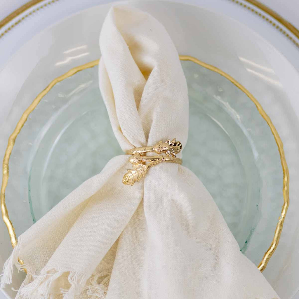 Lovely and Dainty Acorn Branch Napkin Ring Holder in Matte Gold.
