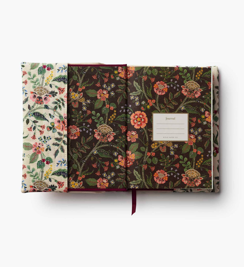 Hardbound with a removable, quilted bookcloth cover, this keepsake journal features gold-ink accents and a grosgrain ribbon to save your place.