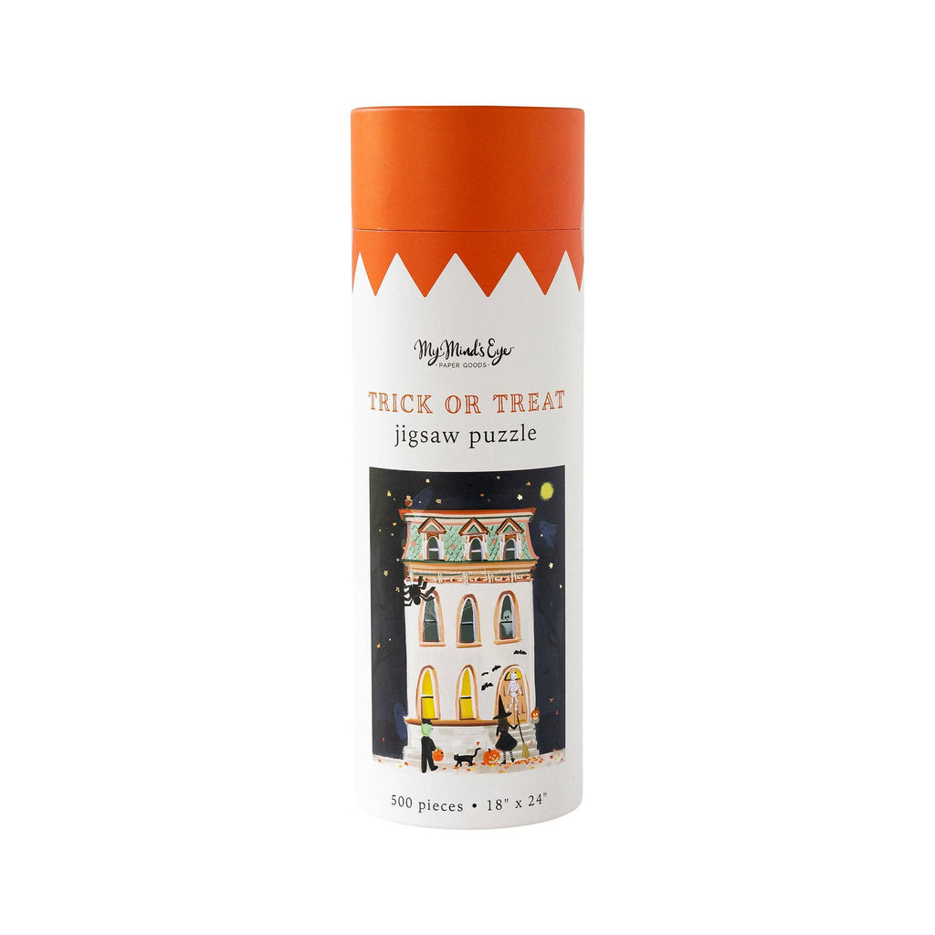 Get ready for some spooky fun with our Trick or Treat Puzzle! Perfect for Halloween, this puzzle will have you tricking and treating until the very end. Get ready to put your mind to the test with this playful and challenging puzzle. • chipboard jigsaw puzzle • 500 pieces • finished puzzle size is 18" x 24"