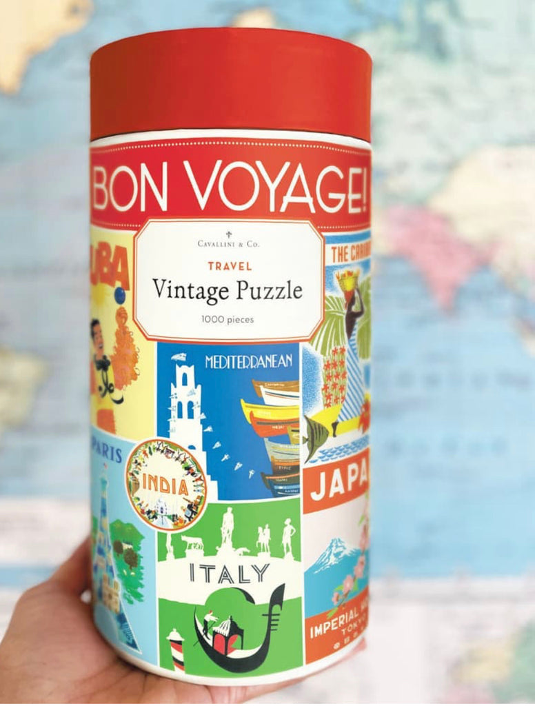 Piece together your own botanical chart with Cavallini & Co.'s Vintage Travel 1000 piece puzzle featuring illustrations & names of cities around the world. Puzzle pieces come stored in a muslin bag inside decorative tube wrapped with a matching design.
